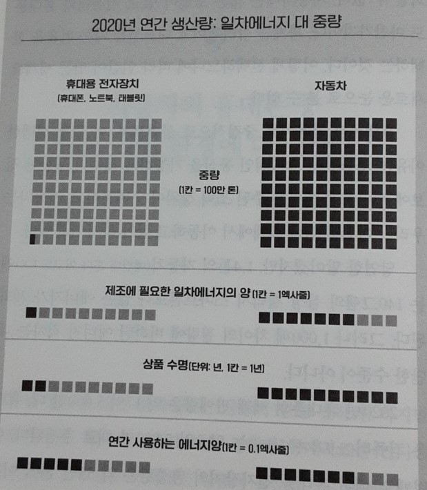 2020년 휴대폰의 세계 판매량은 약 17억 5,000만 대, 휴대용 컴퓨터는 약 2억 5,000만 대로 추정됩니다. 이렇게 판매된 휴대용 전자장치의 총중량은 약 55만 톤에 이릅니다. 1대의 평균 체화율을 휴대폰 0.25기가 줄, 노트북 4.5기가 줄, 태블릿 1기가 줄로 보수적으로 가정하면, 이 장치들을 생산하는 데는 일차에너지가 연간 1 엑사줄이 필요합니다. 이는 뉴질랜드와 헝가리의 연간 에너지 총사용량과 비슷합니다. 자동차 1대의 체화 에너지는 100기가 줄에 조금 못 미칩니다. 2020년에 판매된 7,500만 대의 자동차는 약 7 엑사줄의 에너지를 체화하고 총중량은 약 1억 톤입니다. 따라서 새로 제작된 자동차의 총중량은 휴대용 전자장치의 총중량보다 180배가량 무겁지만, 제작하는 데는 7배의 에너지를 더 사용할 뿐입니다. 물론 고도로 에너지 집약적인 두 장치를 운영하는 데 필요한 에너지 비용은 무척 다릅니다. 미국 소형 승용차는 10년의 사용 기간 동안 약 500기가 줄의 휘발유를 소비하며, 그 양은 승용차에 체화된 에너지 비용의 5배입니다. 스마트폰은 연간 4기가 와트시의 전기만을 소비하고, 2년이란 사용 기간 동안에도 에너지 소비량이 30 메가줄을 넘지 않습니다. 전기를 풍력이나 태양광으로부터 얻는다면 그 양은 스마트폰에 체화된 에너지 비용의 3%에 불과합니다. 석탄을 태워 전기를 얻는다면 그 비율은 8%로 증가합니다.